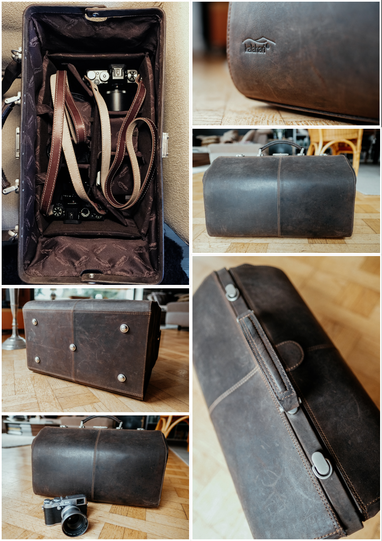 Das Innenpolster ist nicht ganz so schön, etwas glatt und mit dem kalahari-Logo allover bedruckt, aber es erfüllt seinen Zweck und inzwischen habe ich auch eine für mich sinnvolle Aufteilung gefunden. Das Leder ist extrem dick und robust, hat eine schöne Vintage-Anmutung und ist hervorragend verarbeitet und vernäht. Gleiches gilt für Griffe, Schultergurt und Beschläge sowie für den Verschluss. Ein Klick und alles ist zu. Die Karabiner des Schultergurtes können sich lösen, wenn man sie verdreht und dann die Tasche am Gurt hochnimmt, das ist etwas blöd, aber vermeidbar. Unter dem Boden sind 5 dicke Stahlpinökel, auf denen die Tasche ruht, da wird also auch nichts dreckig, wenn sie mal im Nassen steht.